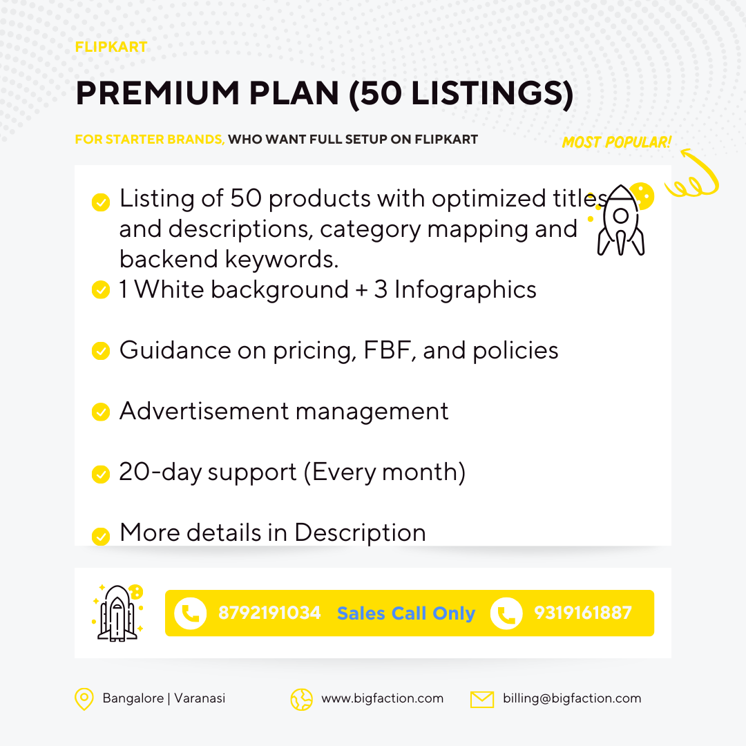 A complete growth solution for serious Flipkart sellers, our Flipkart Premium Service is designed to elevate your brand visibility, optimize performance, and drive consistent sales with expert-led support across every key area.