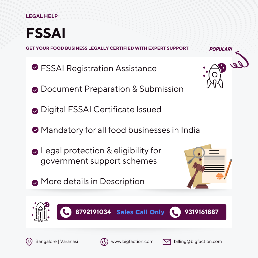 <blockquote><strong>Start selling food legally and confidently — Get your FSSAI license today with Big Faction.</strong><br>📩 <em>Quick process. Full support. 100% online.</em></blockquote>